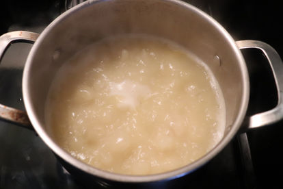 2. On medium heat throw in the rice and stir until well mixed, milky looking.