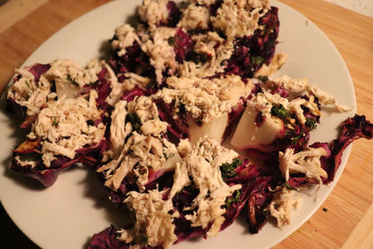 1. Preheat oven while you remove the outside layers of the cabbage. Proceed to cut it into 3-4 sections about 3/4 of an inch thick.