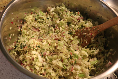 1. Throw all of your ingredients into a bowl. Pound with a meat hammer or whatever utensil you carry that can mimic the job. Just keep pounding until everything comes together and the juices are released. Once everything becomes soft, divide into two wide mouth mason jars. Press the cabbage down so that the juices rise to the top, but leave at least one inch from the top of the jar. Place lids on tightly and let sit at room temperature for about 3 days.